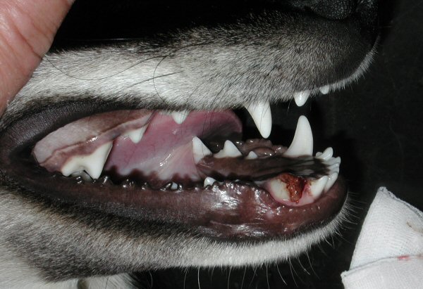 Hundur. Brotin tøkutonn í undirkafti.